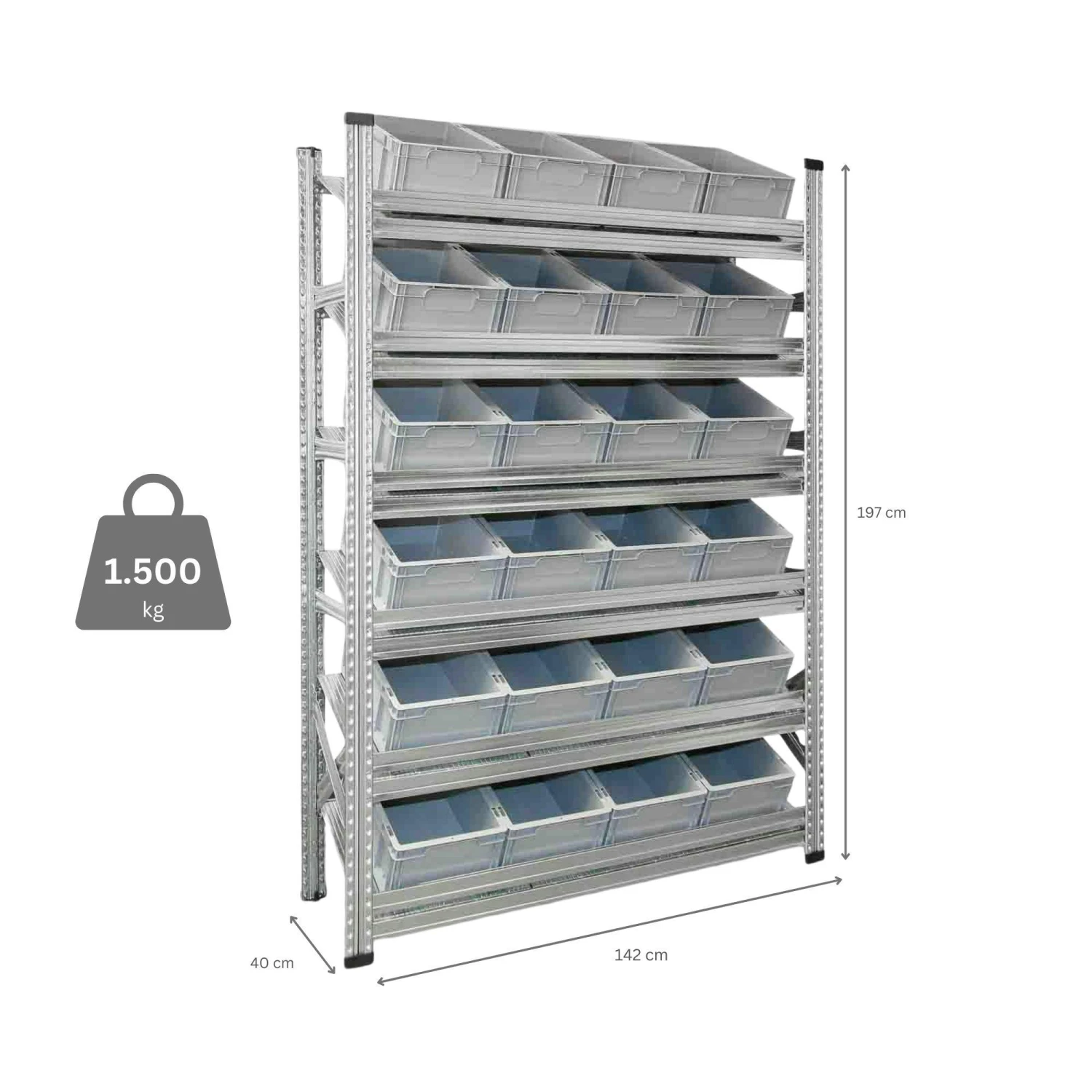 DIE LÖSUNG FÜR MATERIALBEREITSTELLUNG – NextGen Stabiles Schrägboden Grundregal für Euroboxen, Eruobehälter, StapelbehälterGEPRÜFTE SICHERHEIT – Hergestellt aus zertifiziertem Stahlblech und TÜV-geprüft gemäß BGR 234HOHE TRAGLAST – Hohe Traglast von 180kg pro Ebene bzw. Gesamttraglast von 1.500kg & durch Anbauregal erweiterbarEINFACHER & SCHNELLER AUFBAU – Der Aufbau ist durch schraubenlose Steckverbindngen unkompliziert, einfach und in 15-20 Minuten erledigtMADE IN EU – das Schrägboden-Steckregal ist in der EU gefertigt