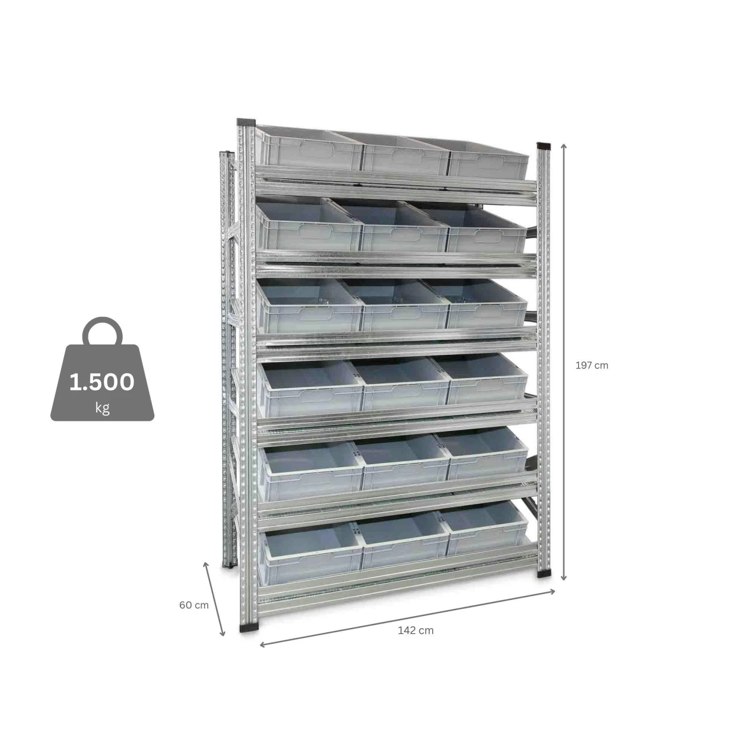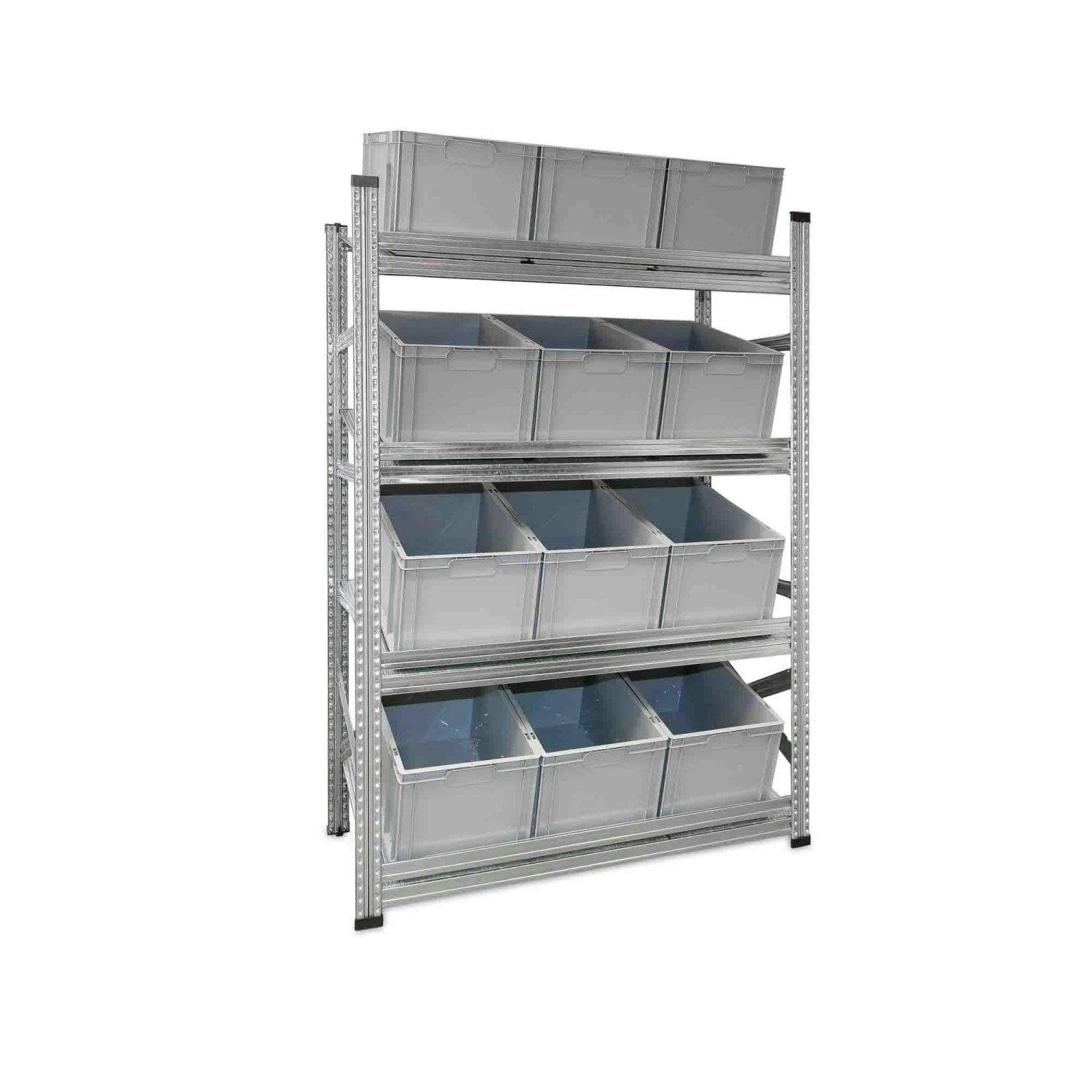 DIE LÖSUNG FÜR MATERIALBEREITSTELLUNG – NextGen Stabiles Schrägboden Grundregal für Euroboxen, Eruobehälter, StapelbehälterGEPRÜFTE SICHERHEIT – Hergestellt aus zertifiziertem Stahlblech und TÜV-geprüft gemäß BGR 234HOHE TRAGLAST – Hohe Traglast von 180kg pro Ebene bzw. Gesamttraglast von 1.500kg & durch Anbauregal erweiterbarEINFACHER & SCHNELLER AUFBAU – Der Aufbau ist durch schraubenlose Steckverbindngen unkompliziert, einfach und in 15-20 Minuten erledigtMADE IN EU – das Schrägboden-Steckregal ist in der EU gefertigt